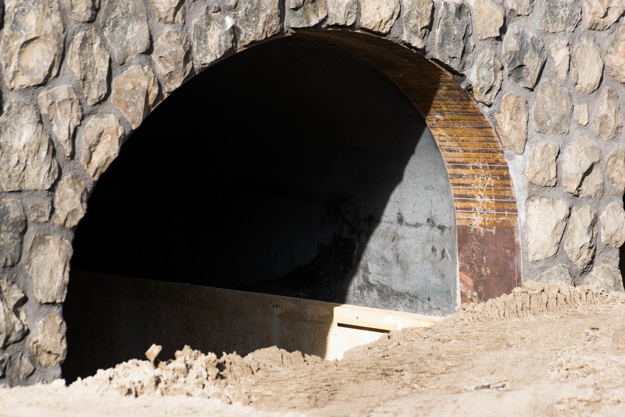 Nadat het betonwerk klaar was is de brug bekleed met basaltstenen door de firma Diekwerker. Naast de brug zijn er grote stapstenen geplaatst als vermaak voor jong en oud.