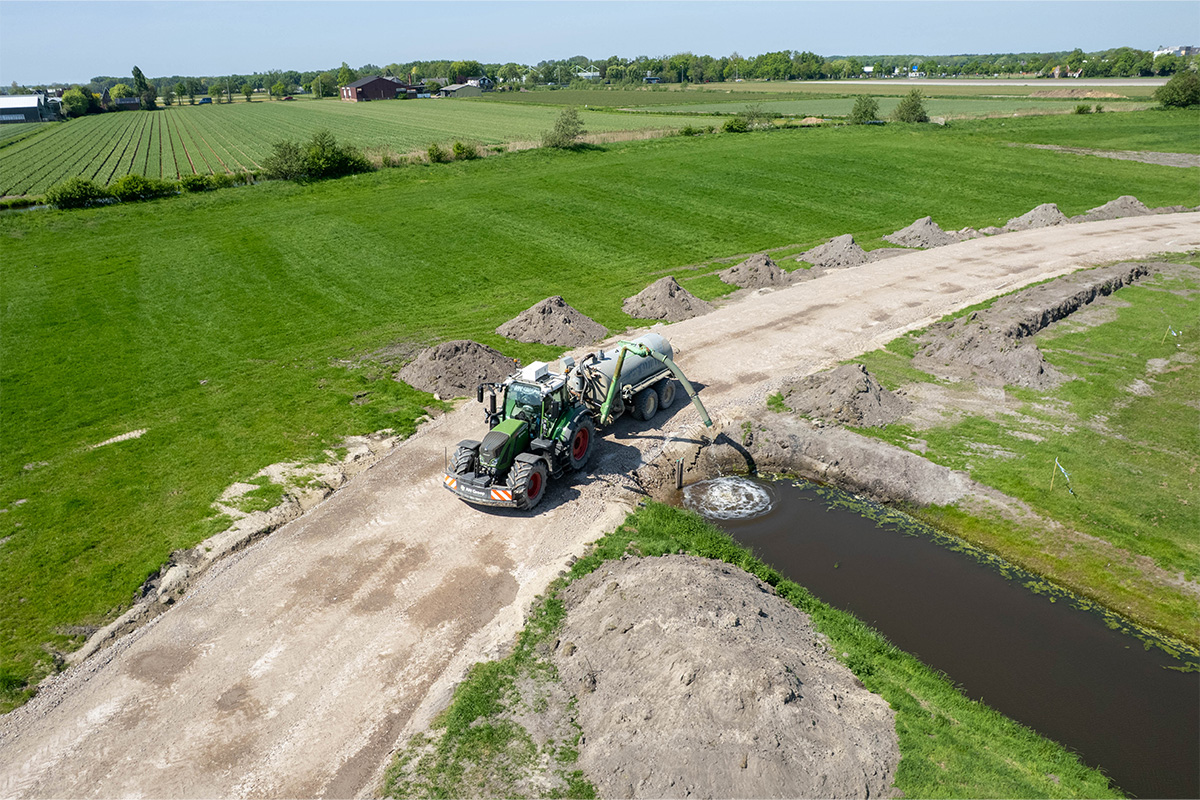Tino vertelt: “Het mooie is dat het een project in ons eigen dorp is. De lijnen met de gemeente zijn kort en de uitvoering sluit aan op wat we vooraf hebben bedacht.” De samenwerking tussen AW Infrabouw en AW Grondstoffen is krachtig. “Dagelijks stemmen wij met elkaar af welke grondstoffen er beschikbaar zijn en of er ruimte op het project is om deze te leveren,” zegt Dirk. “Soms moeten we snel schakelen. Als de grondstoffen niet direct op het project terecht kunnen, leggen we het tijdelijk in depot.” Ook in de uitvoering is de afstemming cruciaal. Tino: “We werken in een poldergebied, waarbij het beheersen van de waterhuishouding en bodemgesteldheid om vakkennis vragen.”