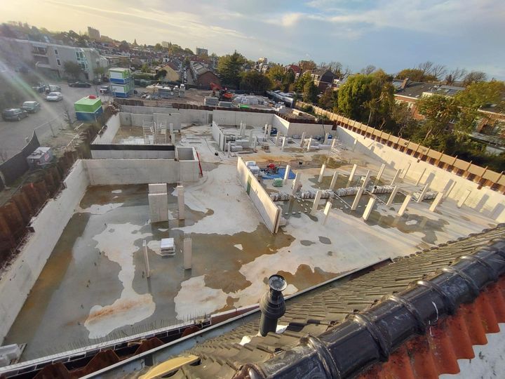 Na het plaatsen van de palen is de bouwkuip ontgraven en is er gestart met het betonwerk van de kelder. De wanden van de betonnen parkeerkelder zijn gestort met beton van Bollenbeton. Nadat het beton zijn gewenste sterkte heeft bereikt zijn de damwanden weer verwijderd en kon de aannemer beginnen met de bouw van de woningen bovenop de kelder.