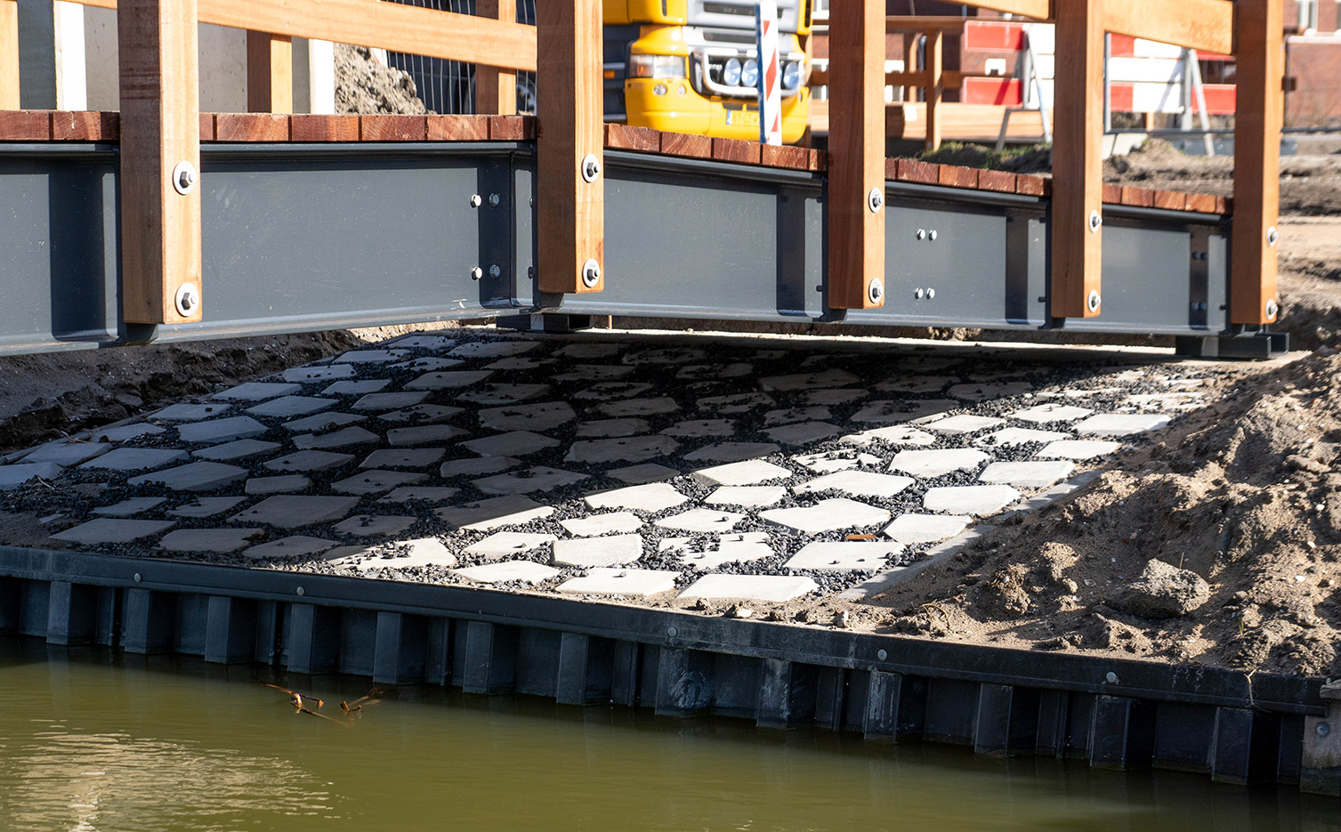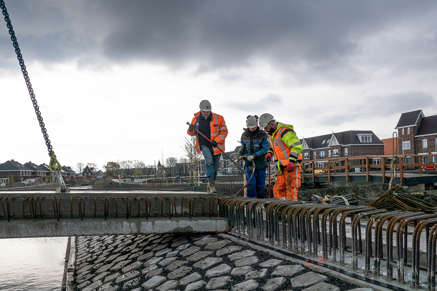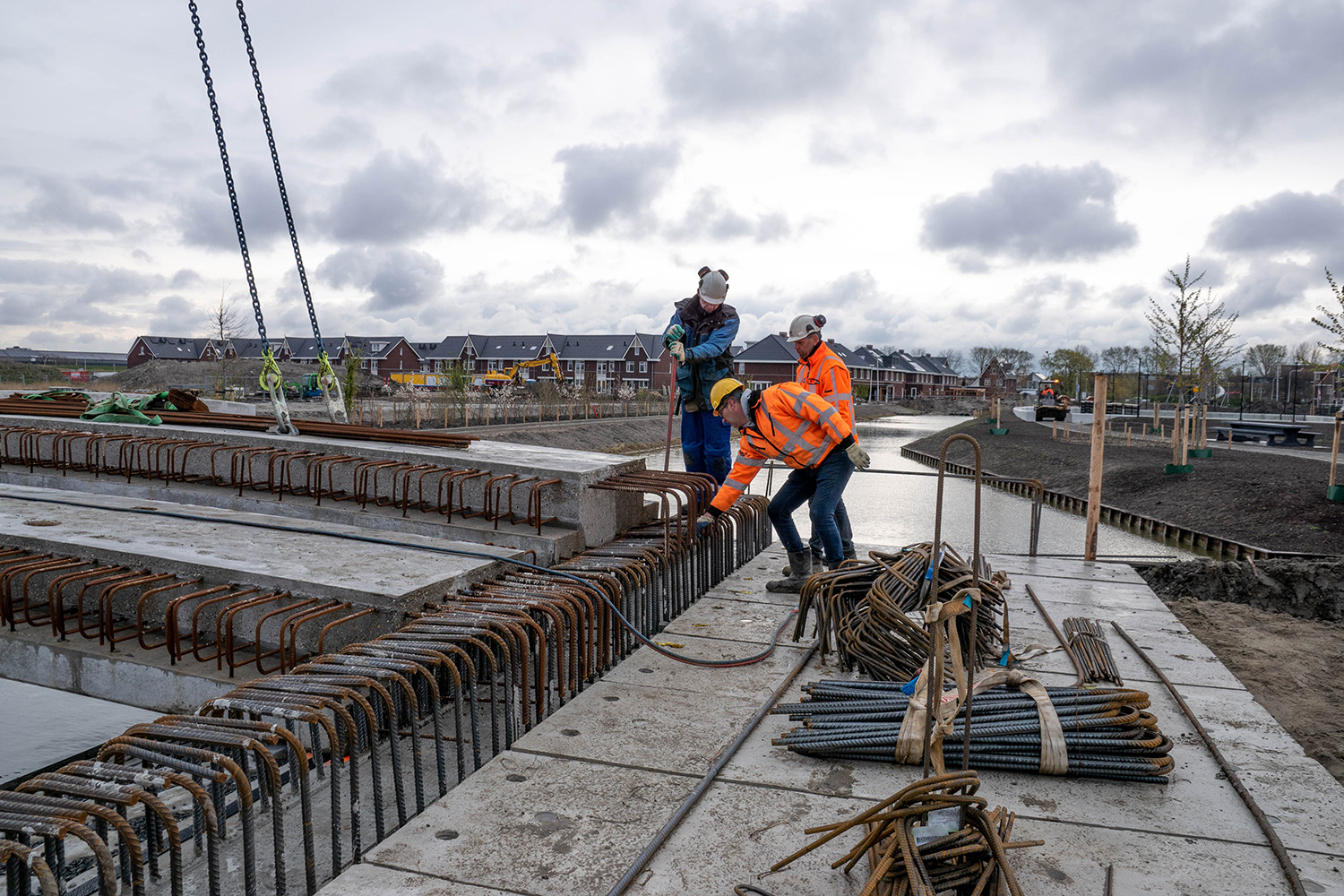 Het maken van een brug is puur vakmanschap! De brug bestaat uit landhoofden, vleugelwanden en voorgespannen liggers. Op de voorgespannen liggers na, zijn alle betonwerkzaamheden op het werk uitgevoerd. Tijdens deze werkzaamheden zijn ook de bestrating, beschoeiing en taludbekleding aangebracht.