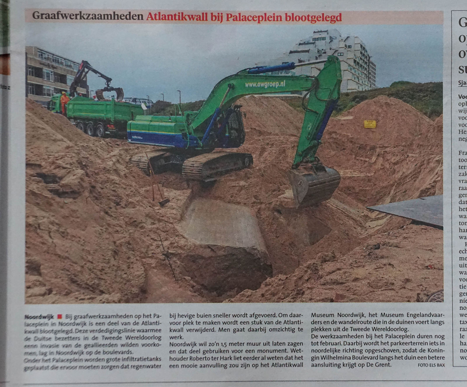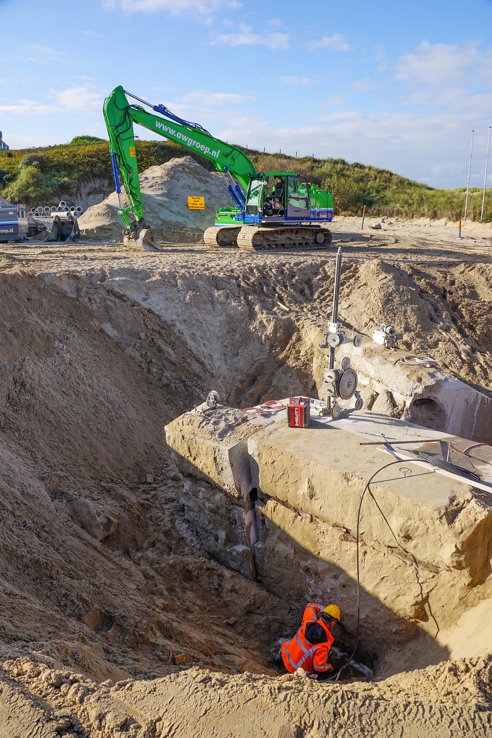 Wat het project uniek maakt, is de aanwezigheid van de Atlantikwall. Deze is door de gemeente Noordwijk in beeld gebracht door middel van een grondradar onderzoek. De anti-tankmuur werd tijdens de tijdens de Tweede Wereldoorlog door de Duitse bezetters gebouwd om een mogelijke geallieerde invasie tegen te houden. Nadat de Atlantikwall is blootgelegd hebben we in samenwerking met de gemeente Noordwijk een plan opgesteld om twee stukken van 1,5 meter veilig te stellen.