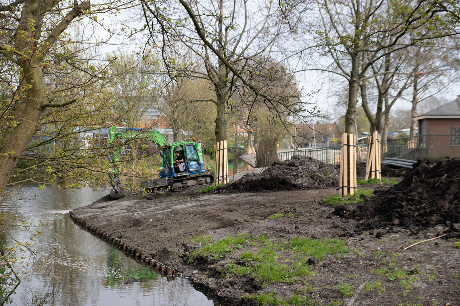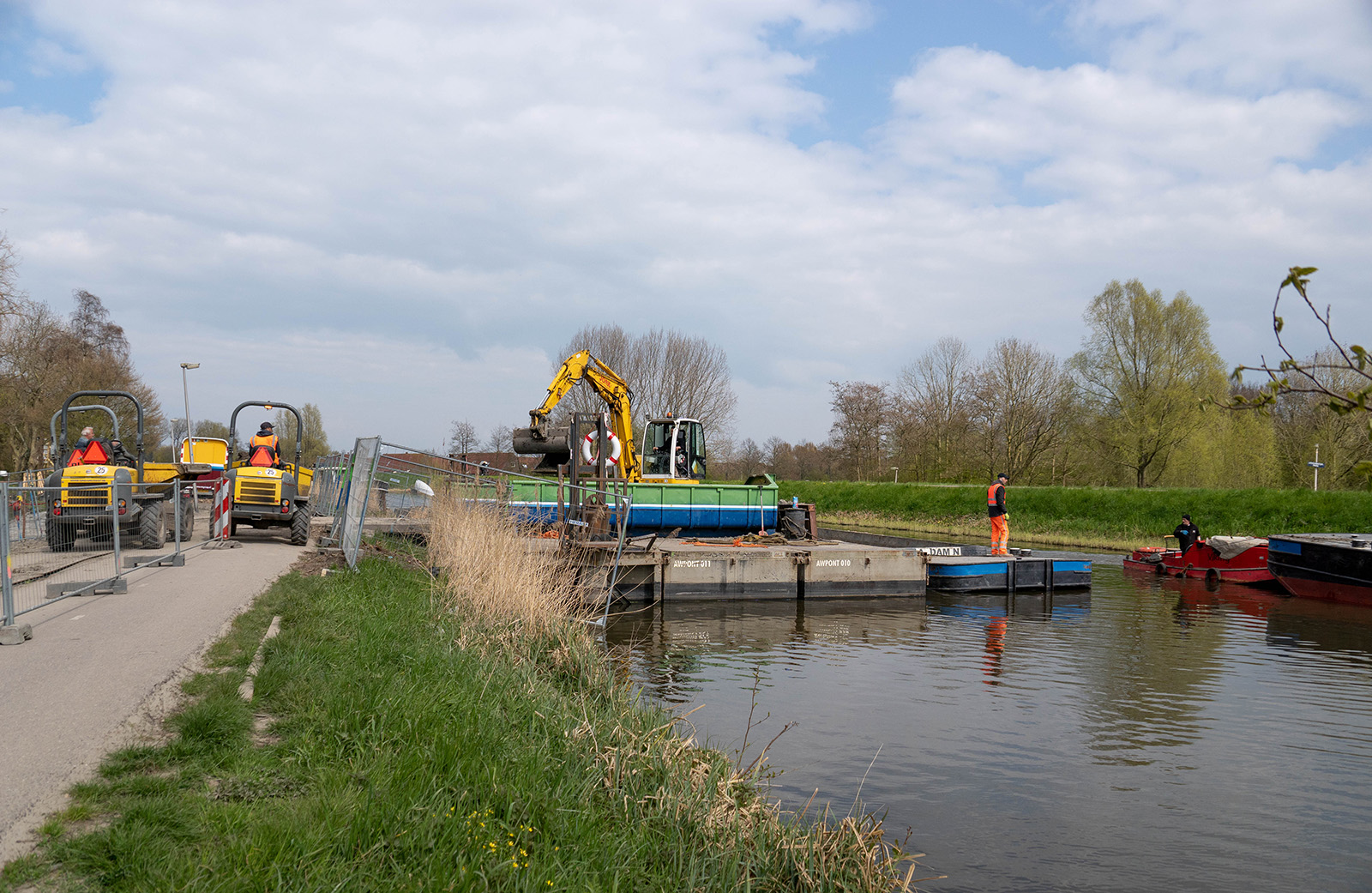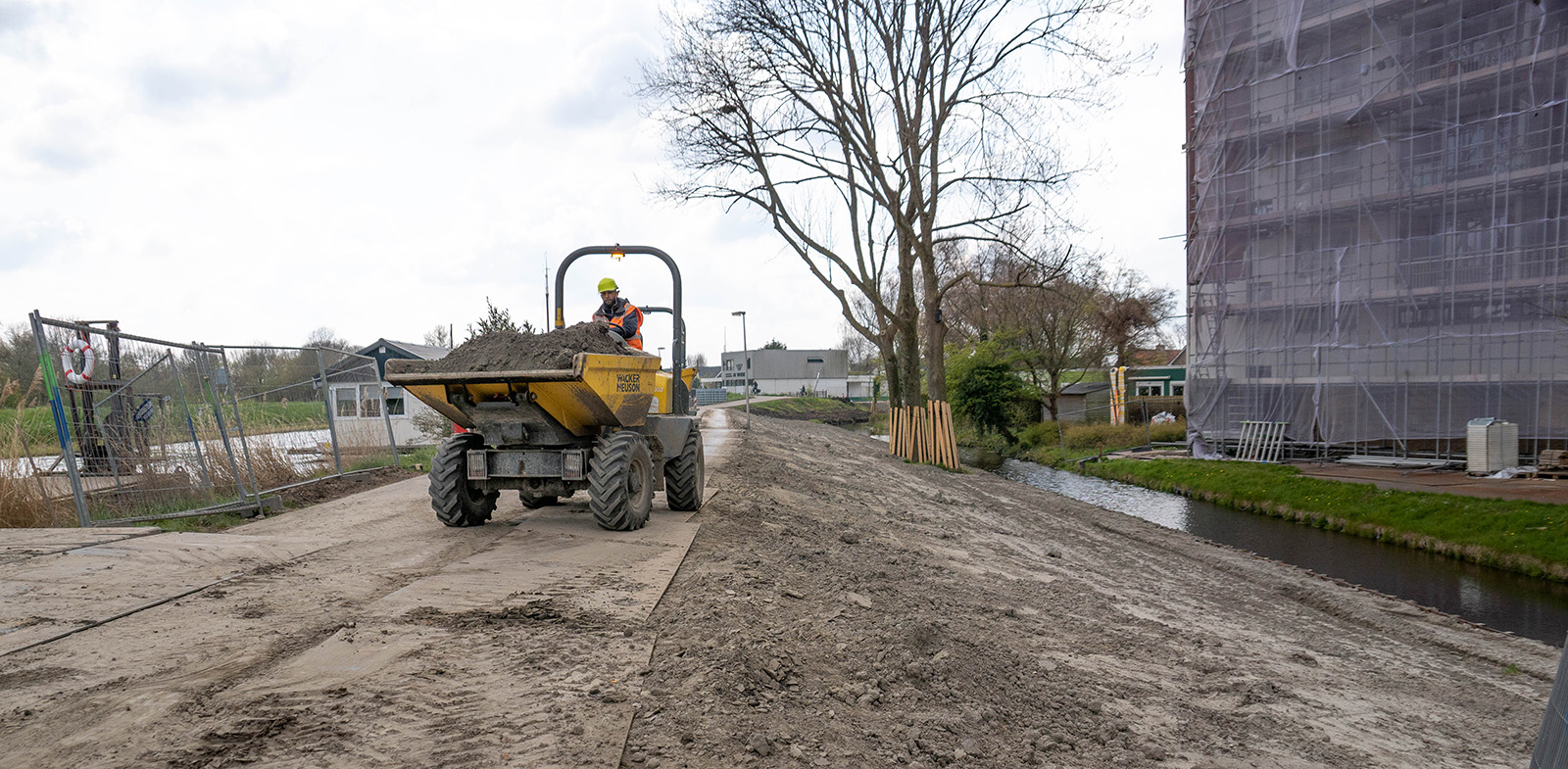 Kleinere hoeveelheden voor beschoeiing en tegelverharding worden wel met vrachtwagens aangevoerd, maar meteen naar het werkvak gebracht. Doordat de vrachten zijn afgestemd op de te verwerken hoeveelheden, wordt ook de ruimte voor opslag beperkt. Op de dijk werken we bewust met lichtgewicht materieel vanwege een beperkte verkeersbelasting.