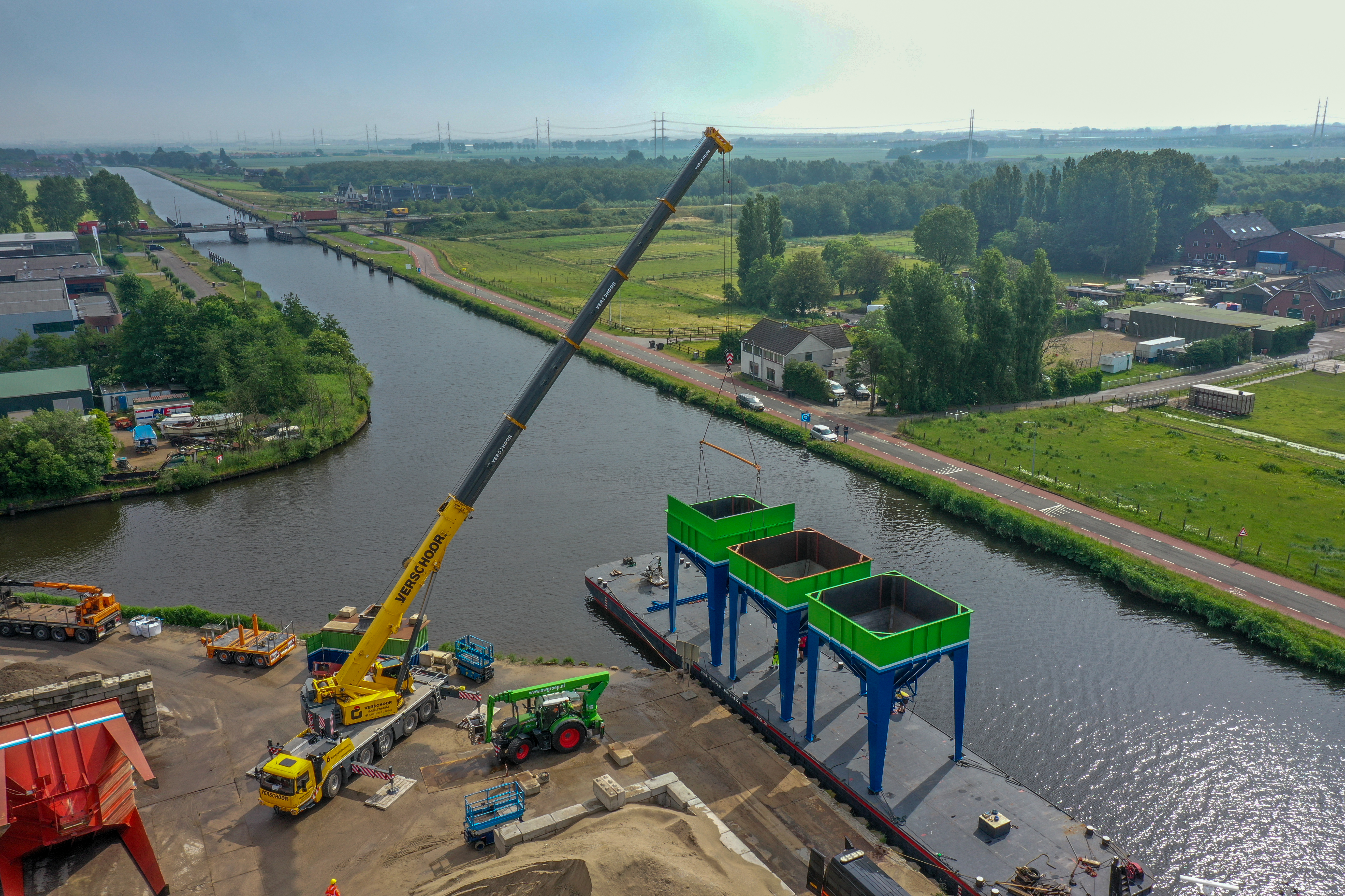 Voor de tocht van Dordrecht naar Hillegom had de schipper circa 24 uur uitgetrokken (inclusief overnachting), ondanks harde wind ging de reis uiterst voorspoedig en afgelopen vrijdag om 10.00 werd er gestart met het lossen. De trechters werden op hun plek gehesen met behulp van een telescoopkraan van Verschoor uit Sassenheim. De dag daarop is de elektra en hydrauliek geïnstalleerd en sindsdien zijn de trechters klaar voor gebruik.