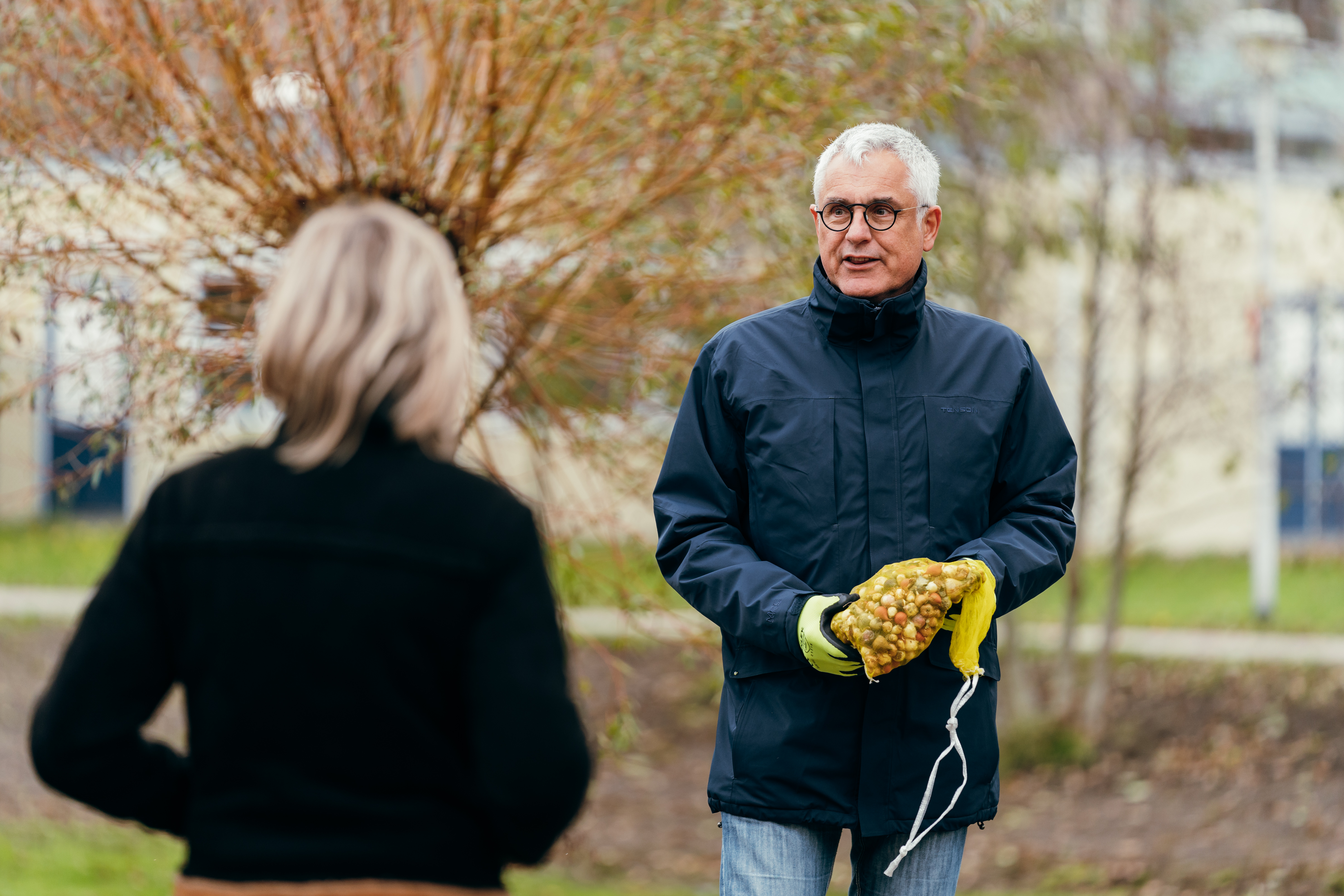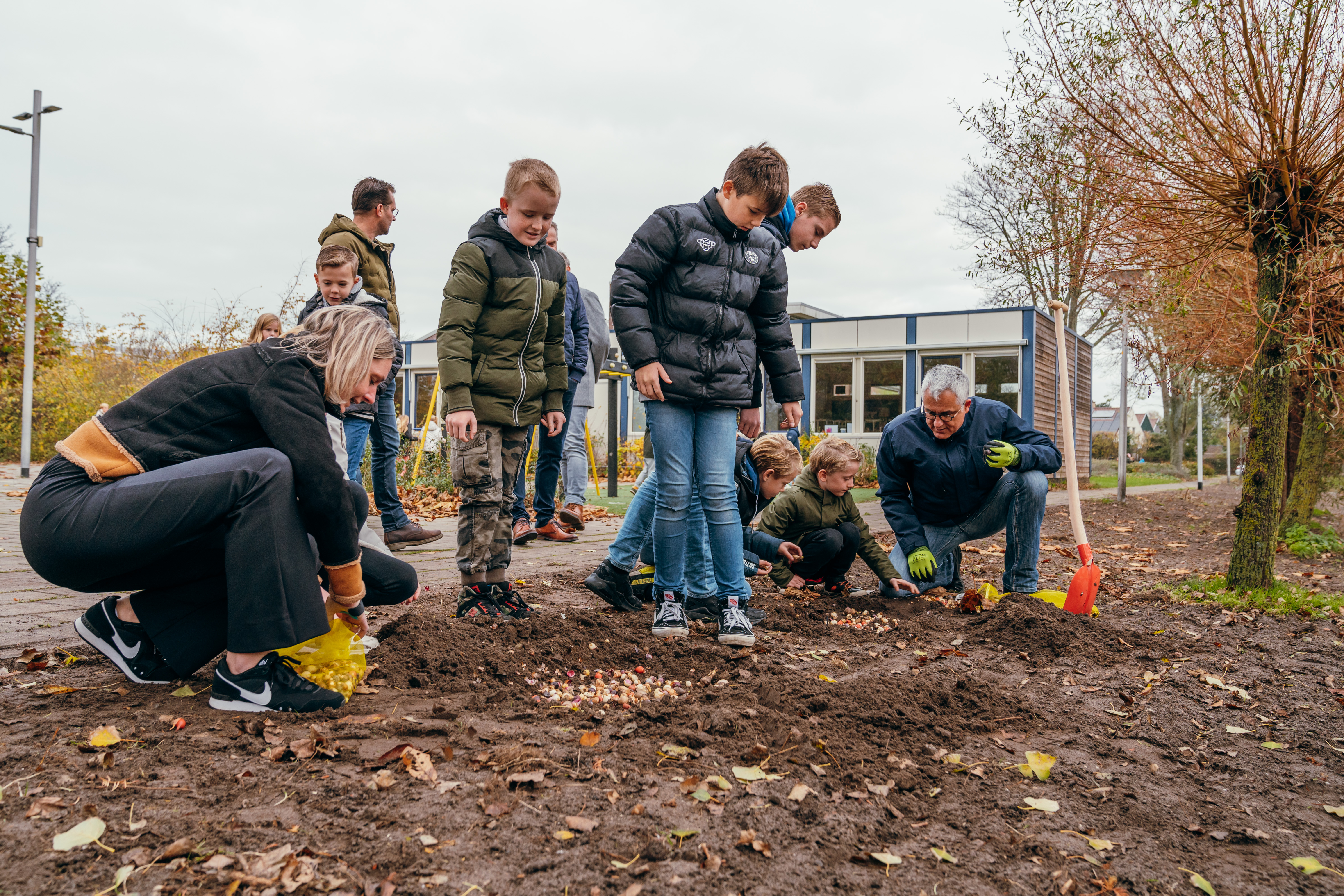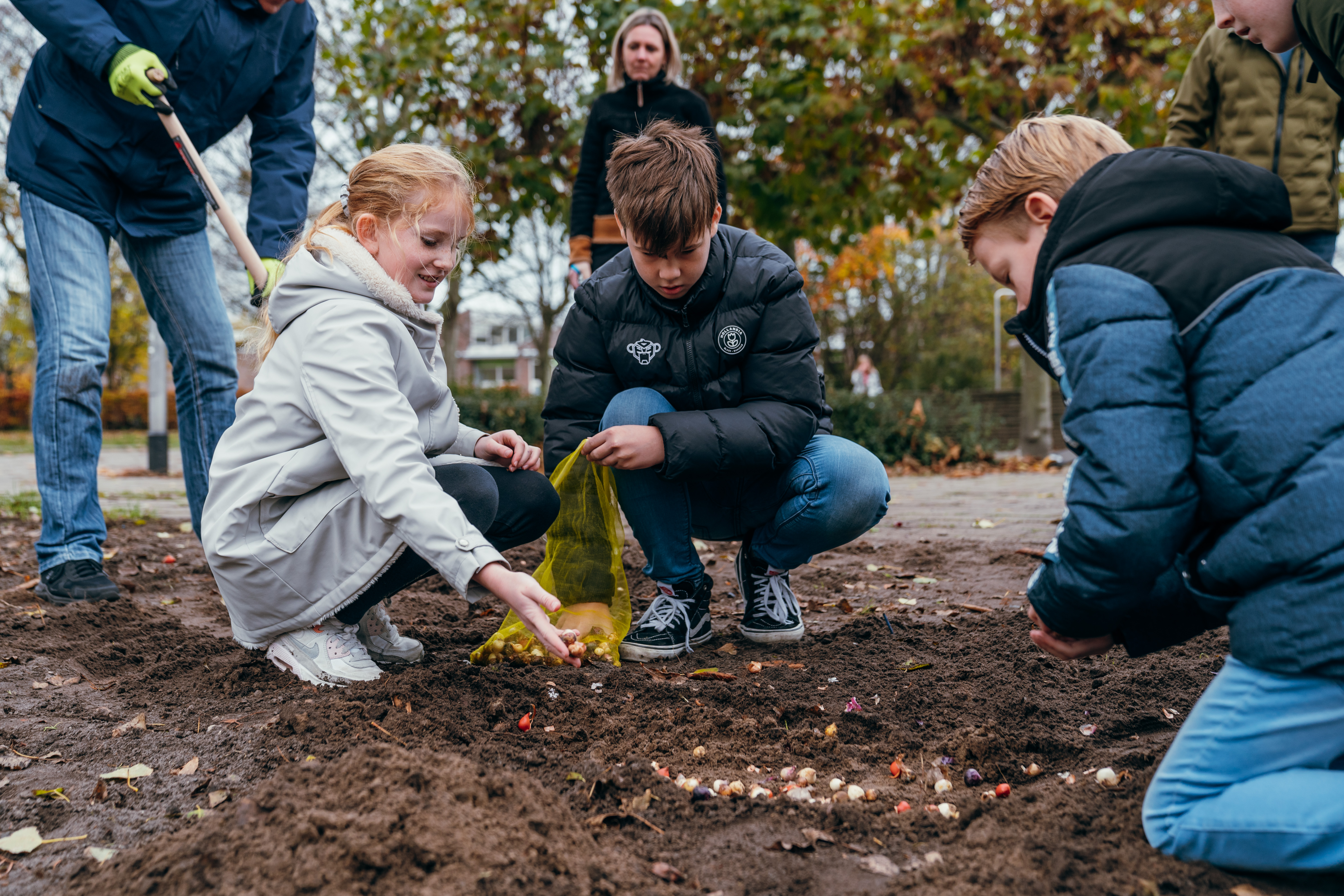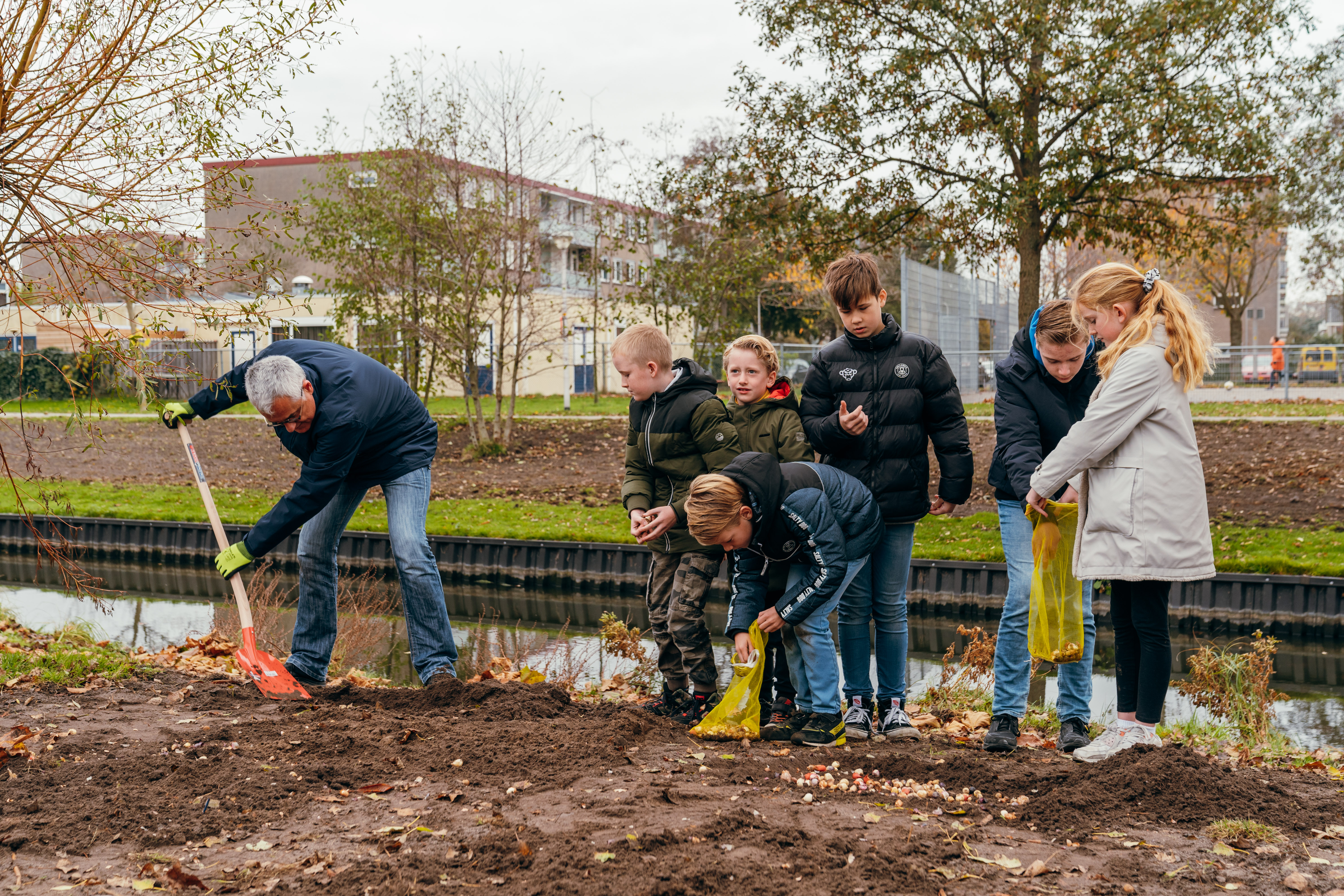 Wethouder en kinderen planten bloembollen